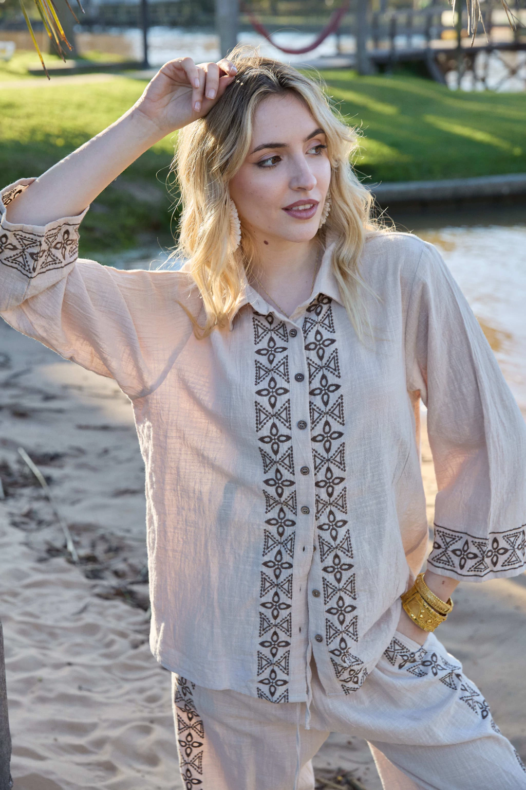 Descubra la sofisticación natural con nuestra Camisa Donna, confeccionada en algodón 100% blanco y natural, importado directamente de India, garantizando calidad y suavidad excepcionales. Este diseño exclusivo presenta delicados detalles bordados que realzan su estilo con un toque artesanal y refinado.