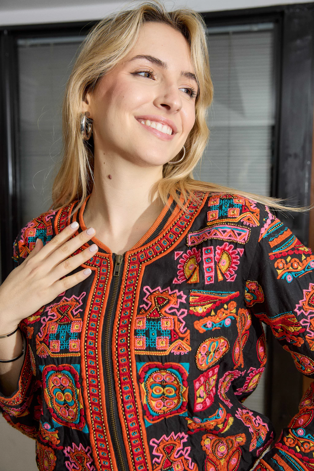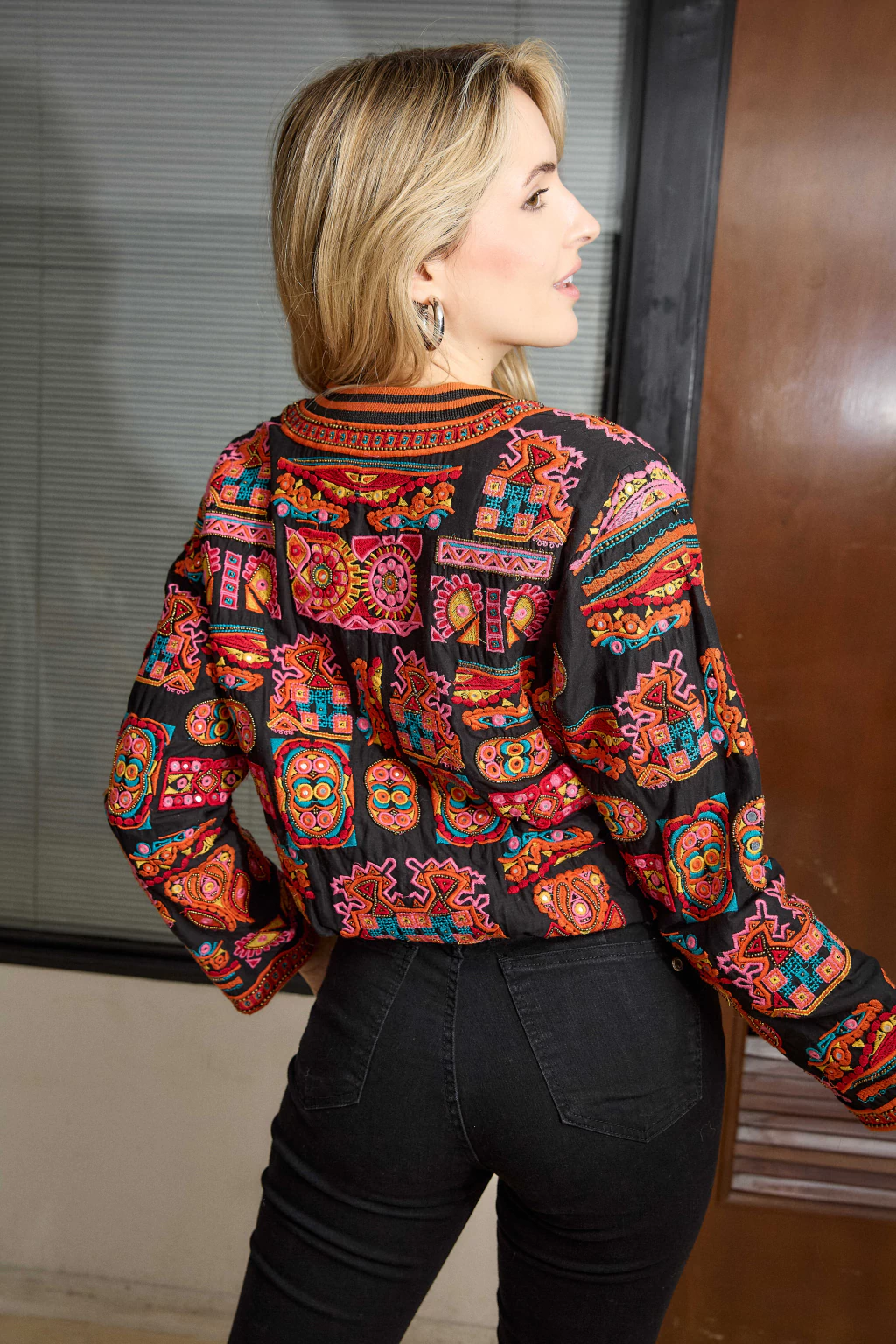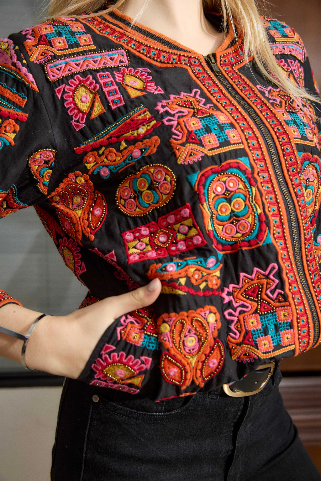 Campera bordada con canutillos dorados e hilos de colores.