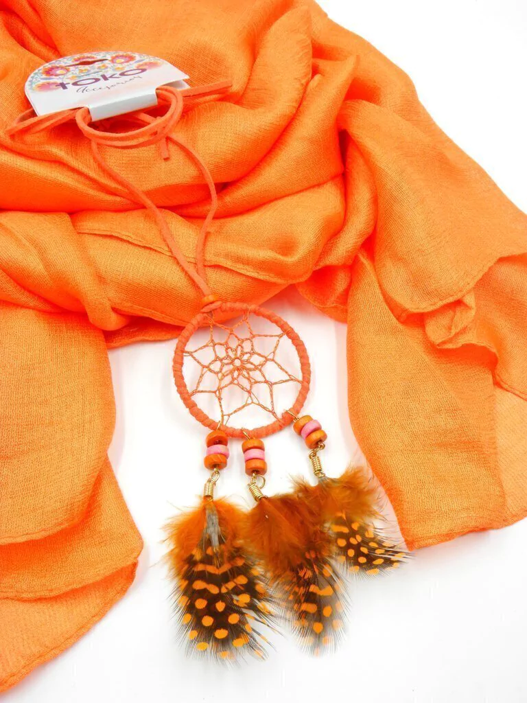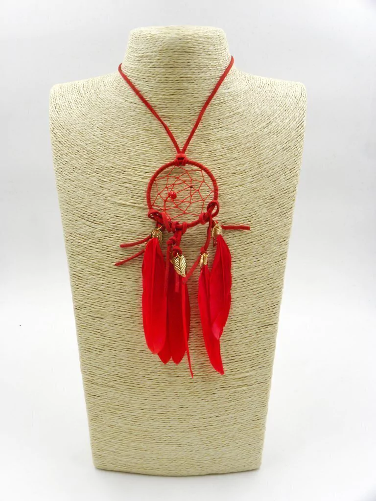 Colgante estilo rustico. Hecho en cuerina, hilo y detalle de plumas al tono.
