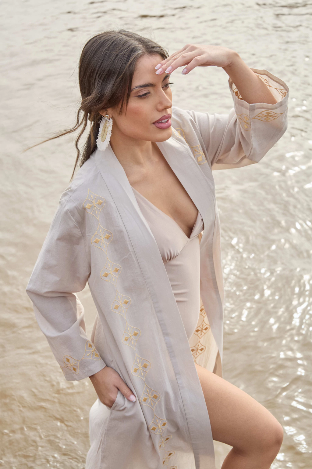 Descubrí la exclusividad del kimono talle único bordado en tonos beige y marrón, importado especialmente para vos. Esta prenda combina la suavidad y calidad de sus materiales con un bordado artesanal que aporta un toque único y sofisticado.