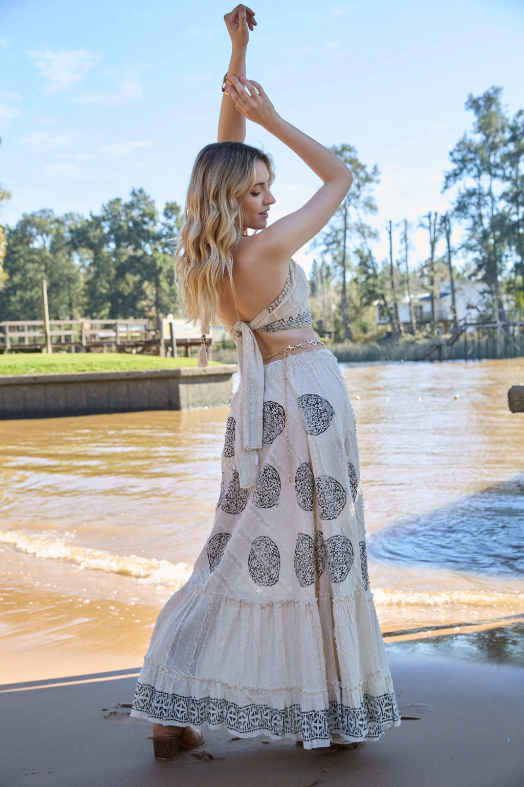 Pollera Lina Confeccionada con un diseño exclusivo de block print, esta pollera larga añade un toque artesanal y sofisticado a tu guardarropa. Su cintura elástica ofrece comodidad y un ajuste perfecto, mientras que el patrón único de estampado resalta por su belleza y estilo. Ideal para ocasiones especiales o para un look relajado y con clase.