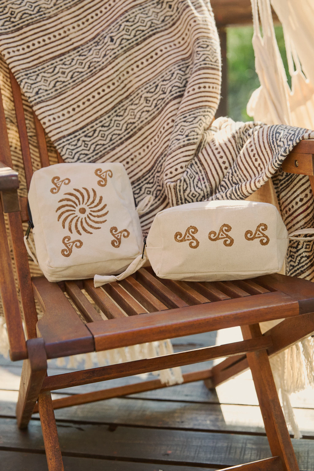Portacosmético elaborado en lona estampada con la técnica tradicional Block Print, que combina durabilidad con un estilo artesanal único. Su tejido resistente y su acabado detallado lo convierten en un accesorio práctico y estético para uso diario o de viaje.